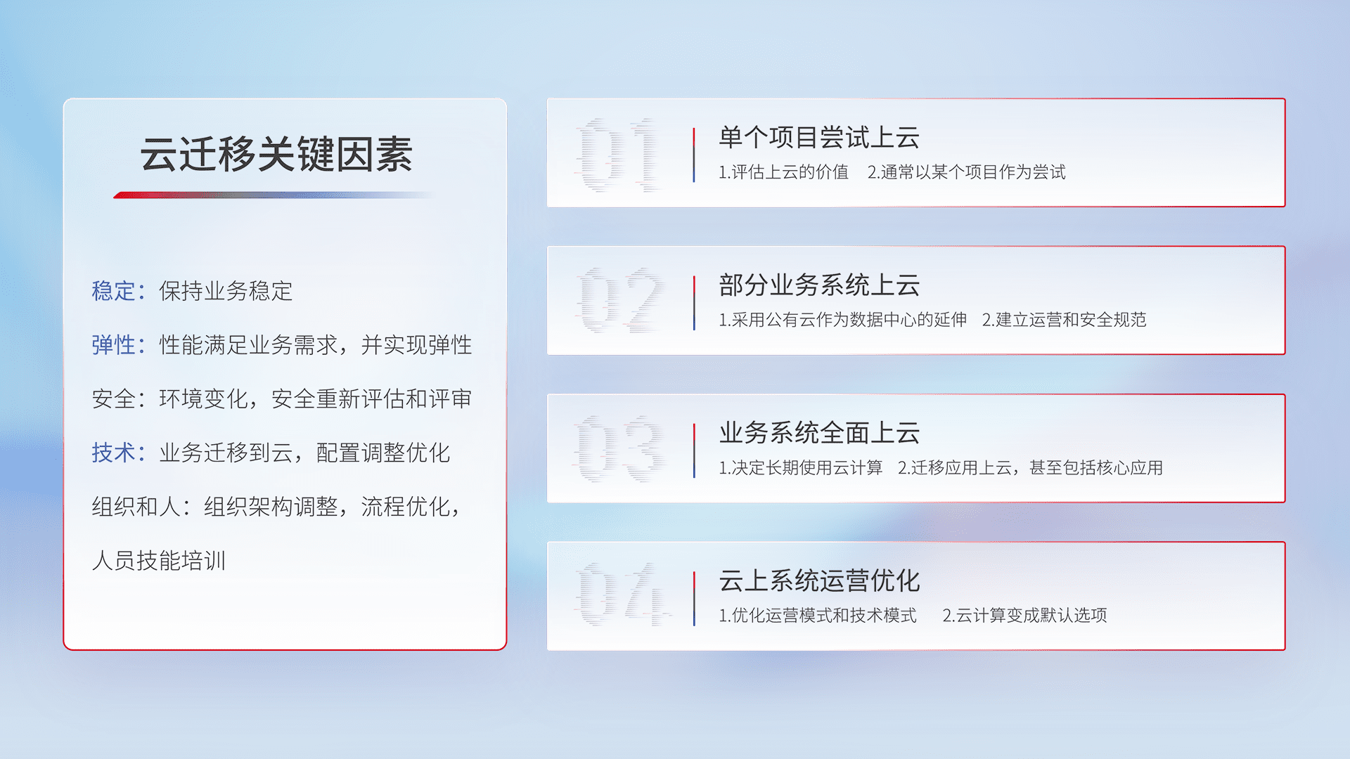 结合实际业务,,,从规划设计、、、、云平台选型、、云原生改造、、、数据迁移、、、、集成交付,,,,迁移全过程为客户识别最佳上云路径,,,做好风险识别管理,,,设计网络架构、、身份权限、、安全审计合规、、、操作审计、、日志审计、、、、监控告警策略、、、多站点容灾设计等,,,对云上基础设施进行整体规划,,提升IT治理水平,,,,以满足弹性、、、高可用、、、、高性能的需求。。。